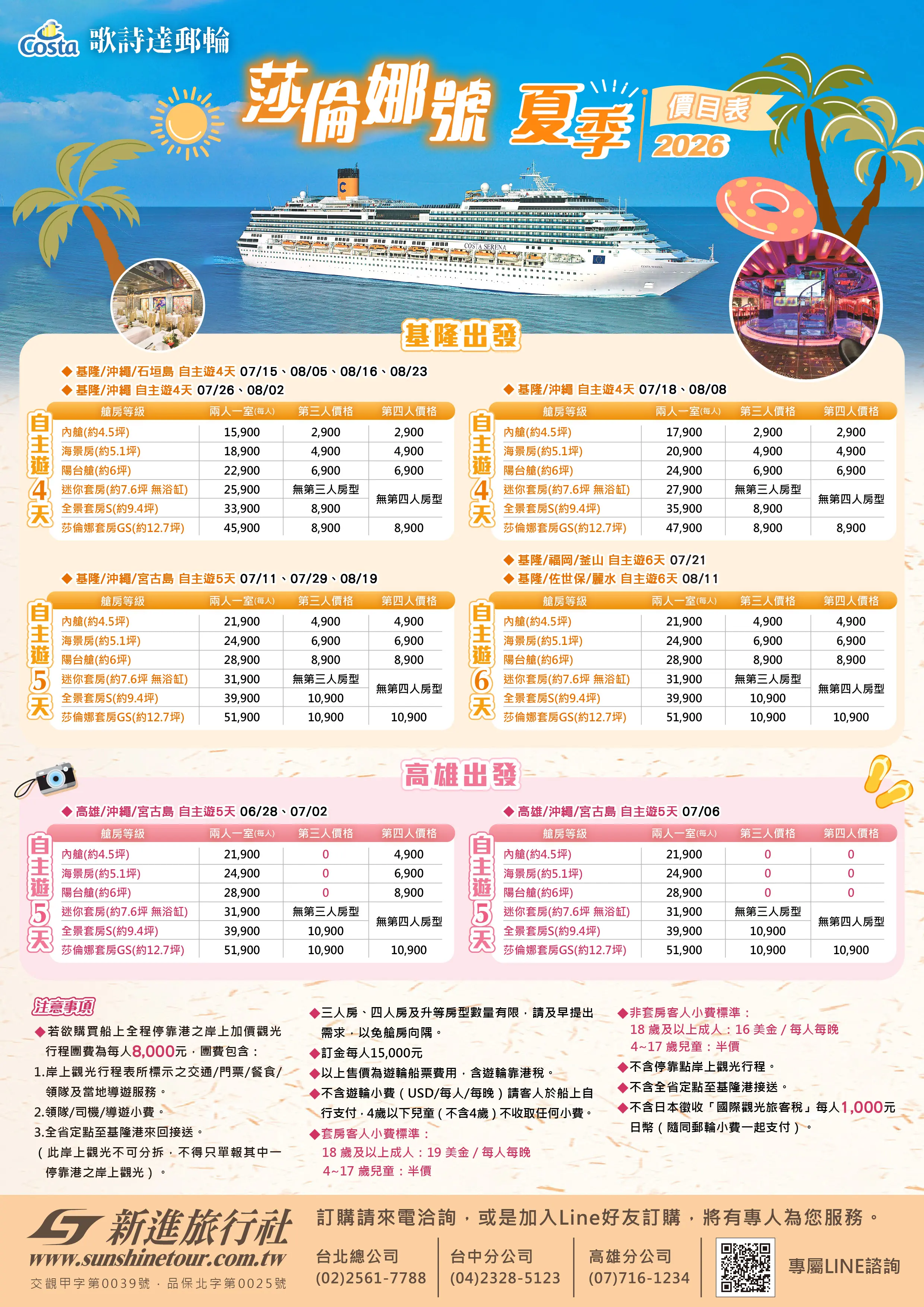 2026夏季航程 基隆&高雄出發 6/28~8/26 共計16個航次 ,熱賣中!!