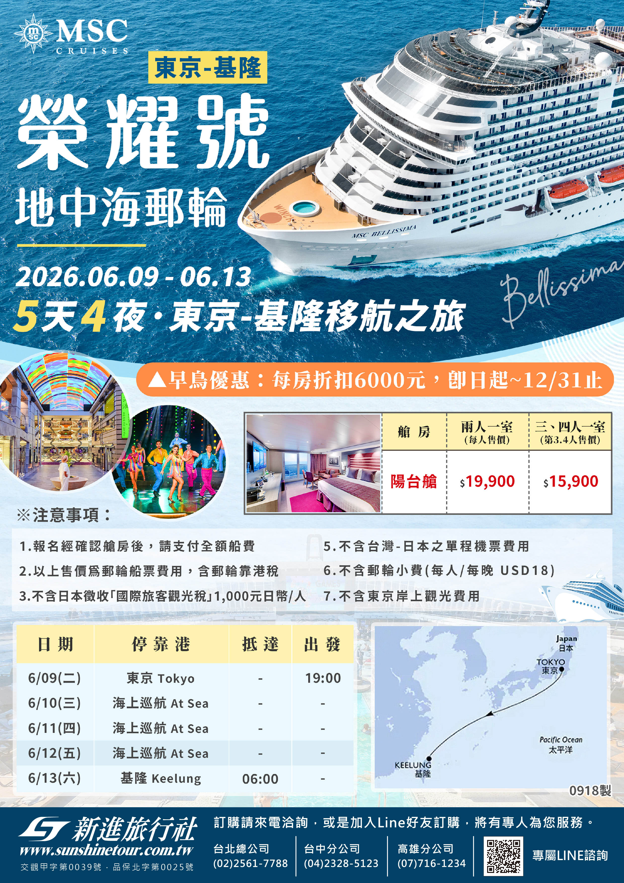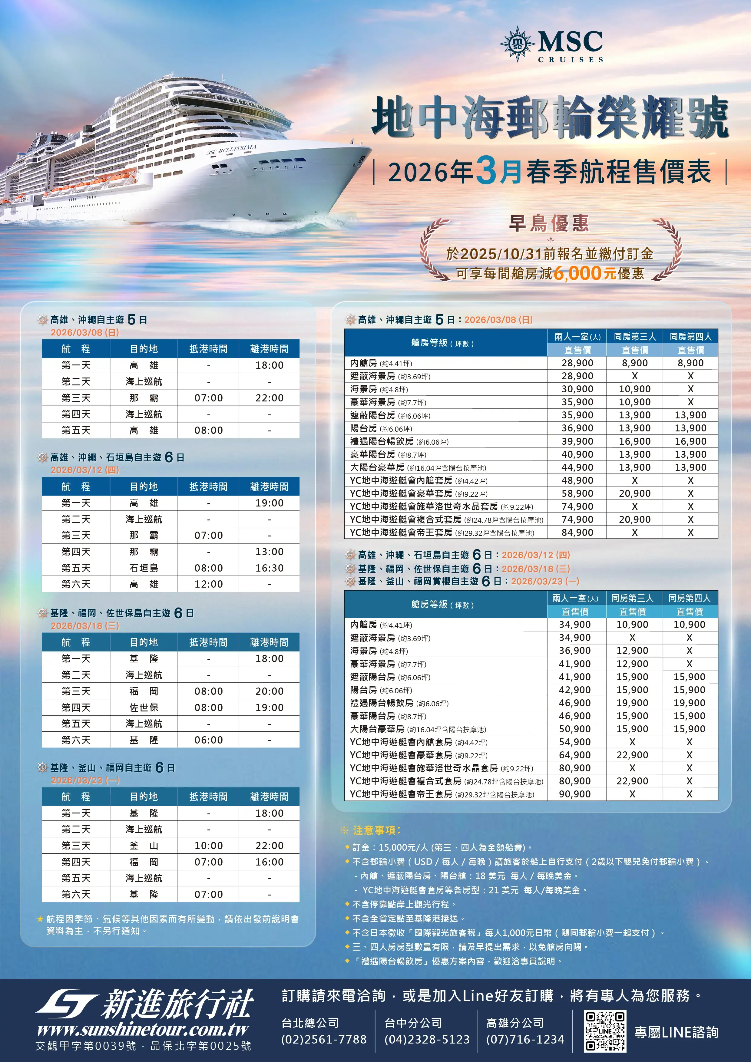 ※限定11/29、12/03、12/07、12/11、12/19、12/27、2026/01/09、1/13、1/17出發航次(艙房有限、售完為止)