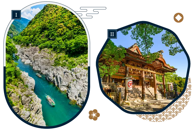 《大步危》由橫貫四國山地的吉野川激流歷經2億年沖積而形成的大峽谷。以擁有像大理石雕刻藝術品般的奇岩絕景而聞名。在經驗豐富的船夫引導下近距離欣賞溪谷美景。