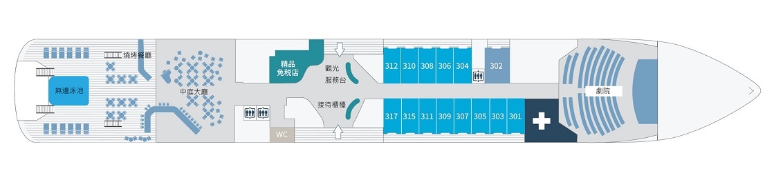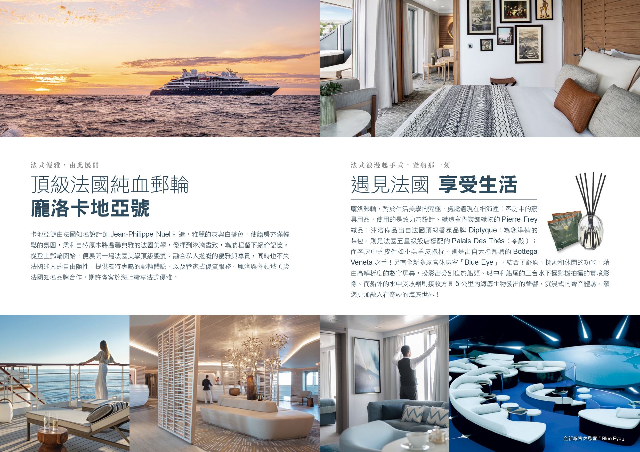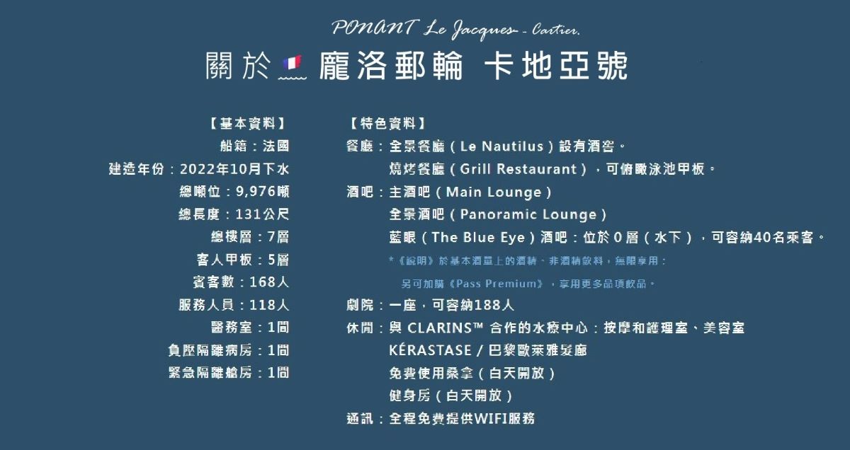 ● 優先登船、登船迎賓香檳、管家服務、每日開胃點心和水果籃