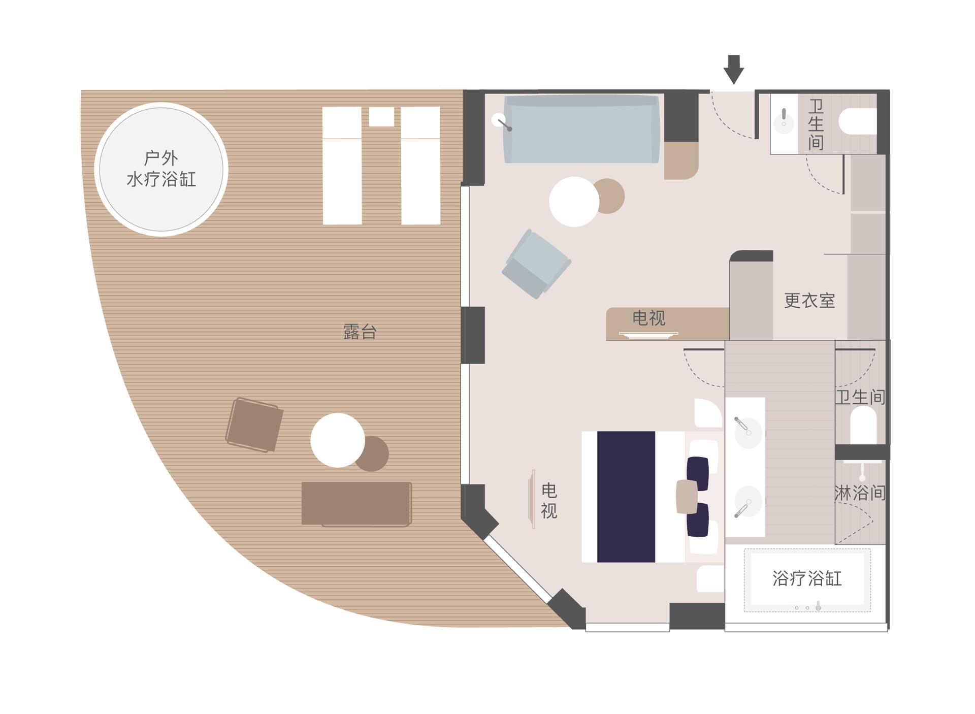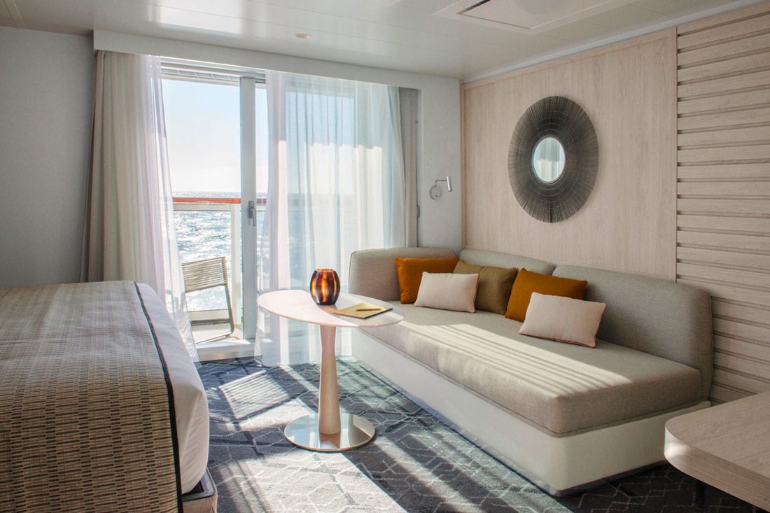 ● 臥室配有一張加大雙人床(180 x 200 公分)或兩張單人床(90 x 200 公分)休息室配有可轉換成雙人床(160 x 190 公分)的沙發、扶手椅和第二台電視,浴室配有淋浴和 Balneo 浴缸、32m²私人陽台(含2張躺椅和4人餐桌 )