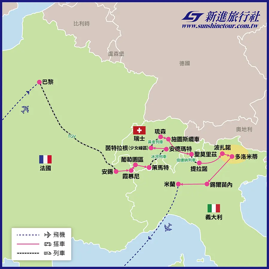 *若遇冰河列車頭等艙調度問題,則改搭二等艙並每人退費NT1,000;將改搭瑞士國鐵或搭配其他交通工具,並依屆時車種與票價核算退費價差,敬請見諒!