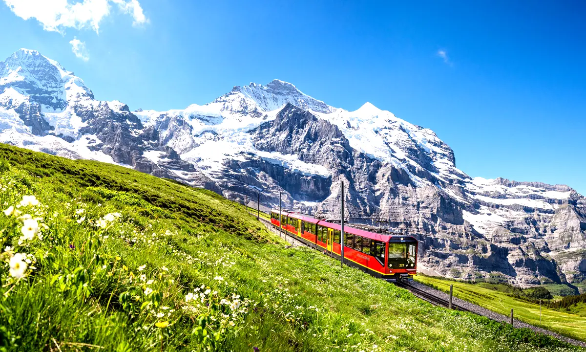 別出心裁的★少女峰之旅要開始了!今早搭上★艾格峰快線,約莫15分鐘即可抵達艾格峰冰川,隨後換車繼續前行,前往海拔4,158公尺的少女峰,沿著軌道穿梭在群山之間,交織成一幅瑞士理想鄉的美麗畫面,抵達歐洲最高的火車站-少女峰山腰火車站。這裡有歐洲最高的郵局、錶店,在斯芬克斯觀景台上,和尚峰、少女峰佇立左右,銀帶般的冰河沿山谷而下,美不勝收。下山改搭★少女峰齒輪火車經克萊雪德後換一台火車繼續前行,返回山中小鎮茵特拉根,位於圖恩湖和布里恩茨湖兩湖之間,而得名“茵特拉根”(有兩湖之間的意思),風光明媚。