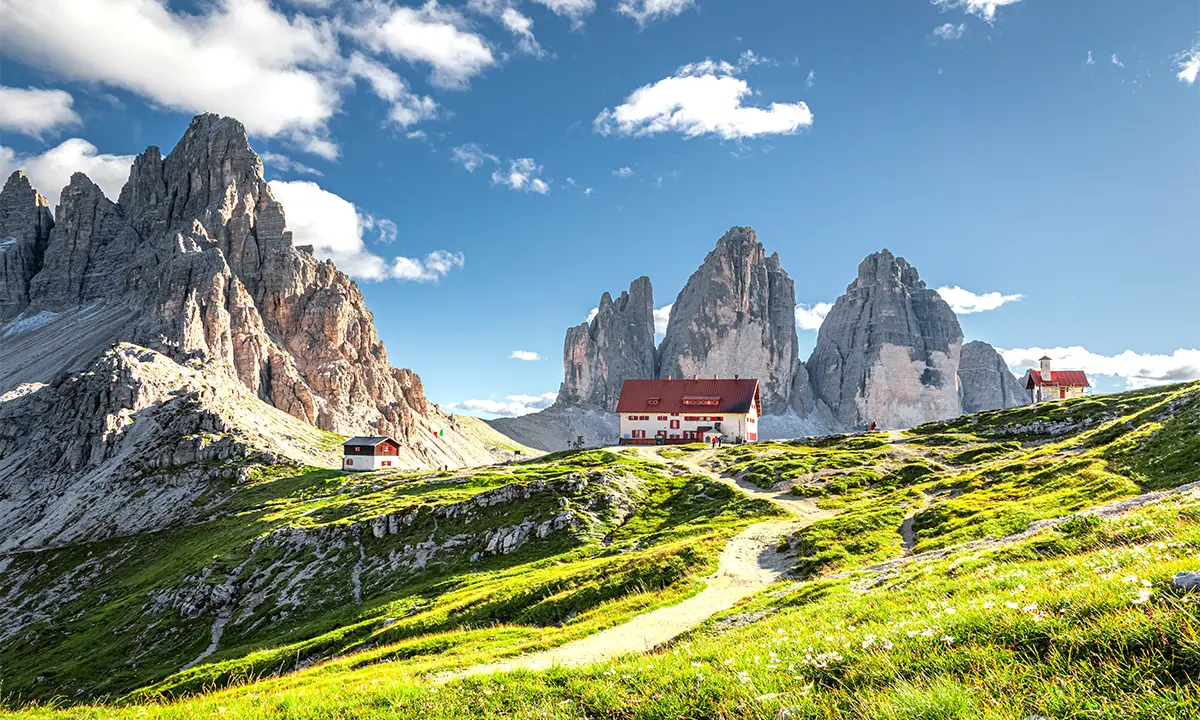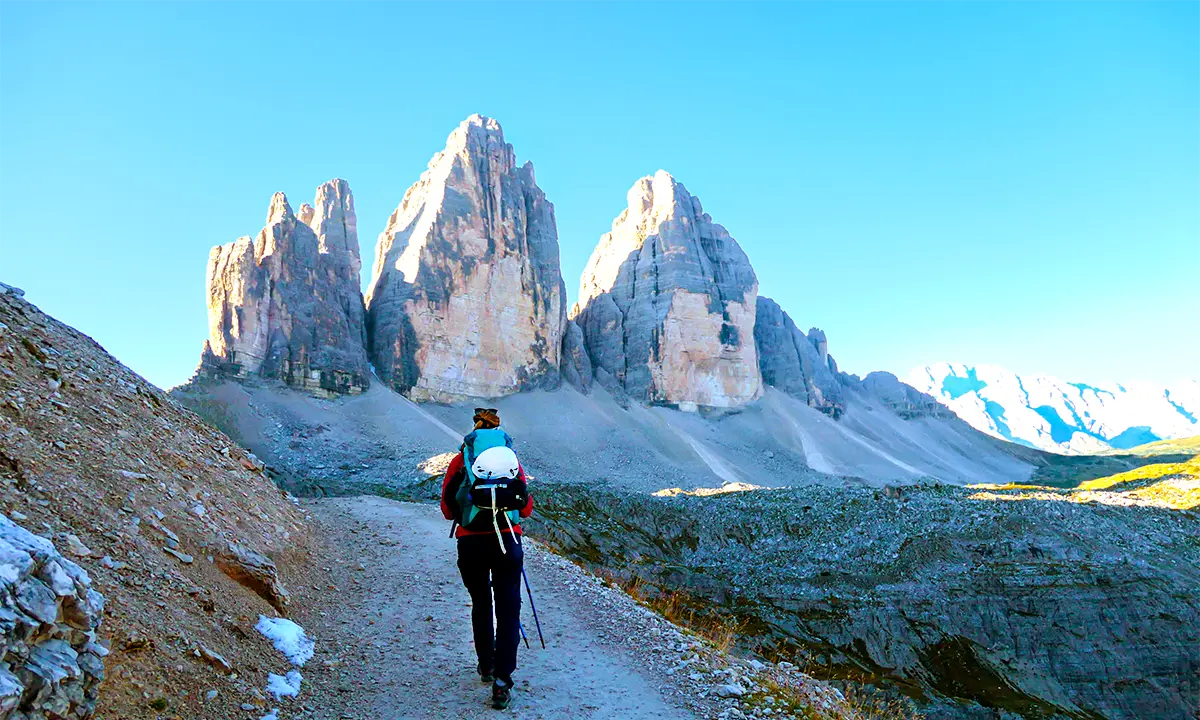 多洛米蒂最著名的地標之一,▲三尖峰以三座獨特並相連的垛口狀山峰群而聞名於世,唯有親臨現場站在它的跟前始能心領神會,我們特別安排一段東多洛米蒂健行,從遠而近,感受那拔地而起的巍峨與震撼。