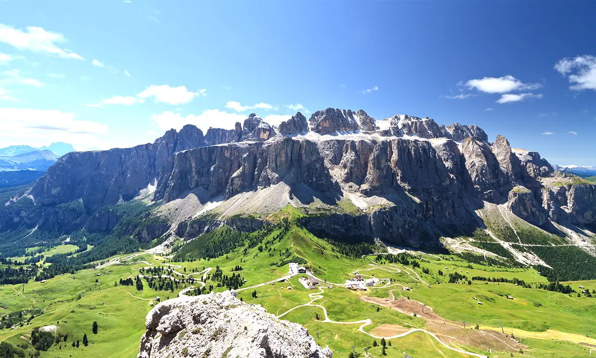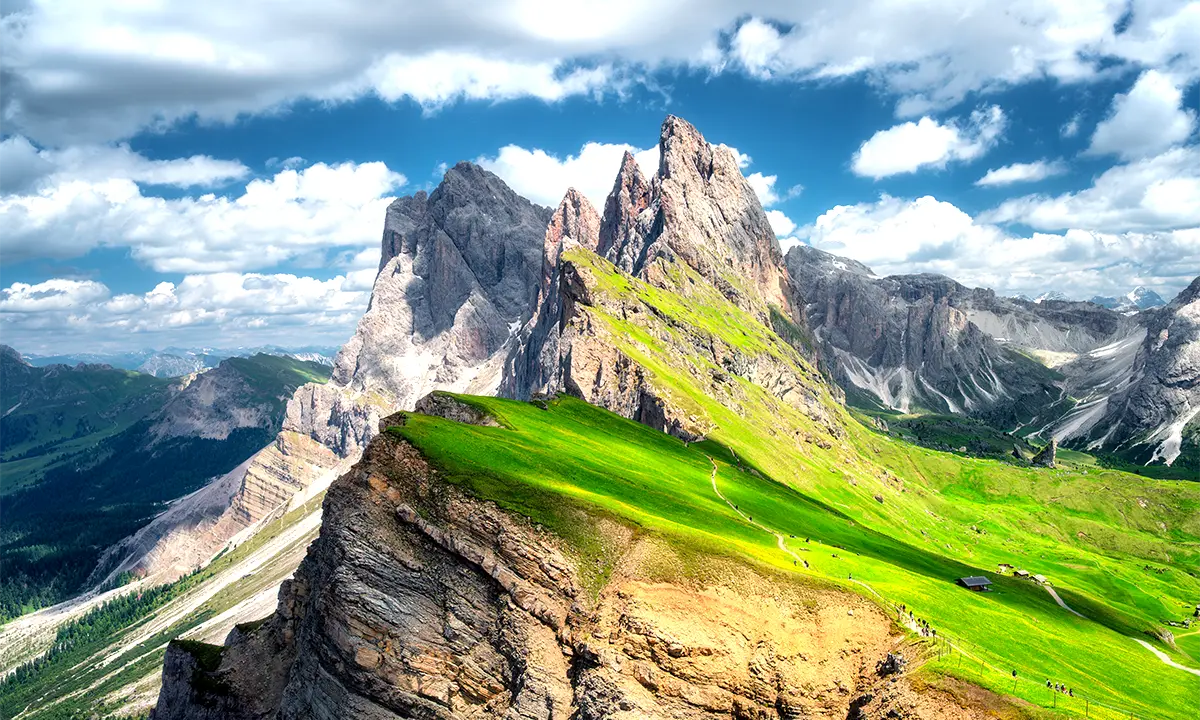刀鋒山以鋸齒狀如軍刀的山脈稜線聞名,位在普埃茲奧德國家公園內,白雲石灰白相間的岩層脈理,特殊的阿爾卑斯高山植披,草原上遍地繁花,綠草如茵。從小鎮換乘★纜車上到高原區,健行小徑星羅棋布,牧場山屋點綴其間,我們特別安排一段西多洛米蒂輕健行路線,壯闊景緻肯定會豐富您的視野。