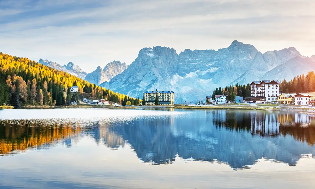 有「多洛米蒂的珍珠」美名,周圍綠草如茵,山巒疊起,天氣好時,遠方的山巒峰影倒映湖中,好一幅動人的湖光山色美景。