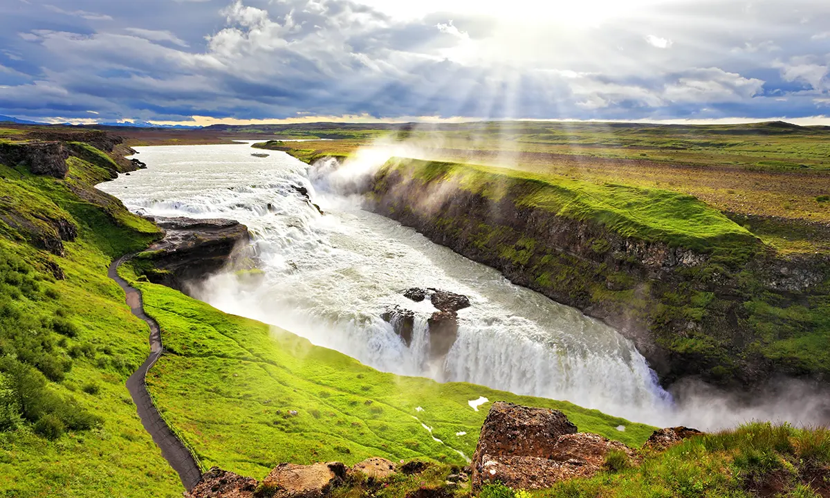 古佛斯瀑布(黃金瀑布/ Gullfoss Waterfall),偏黃色的水質加上整座瀑布會因日落的太陽照映為金黃色,似黃金般的珍貴美景,被譽為冰島最美的瀑布。