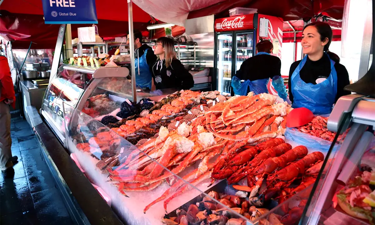 魚市場位在老市區正中心,就在港口邊,這裡從西元16世紀起,就是南北漁貨的集散中心,而今日則是到卑爾根的觀光客必造訪的重要景點,漁市有分露天市場與室內販賣區,可以買到當天最新鮮的魚貨,從鱈魚、鮭魚、龍蝦、螃蟹、北海帝王蟹、干貝、北極甜蝦到鯨魚肉,應有盡有。