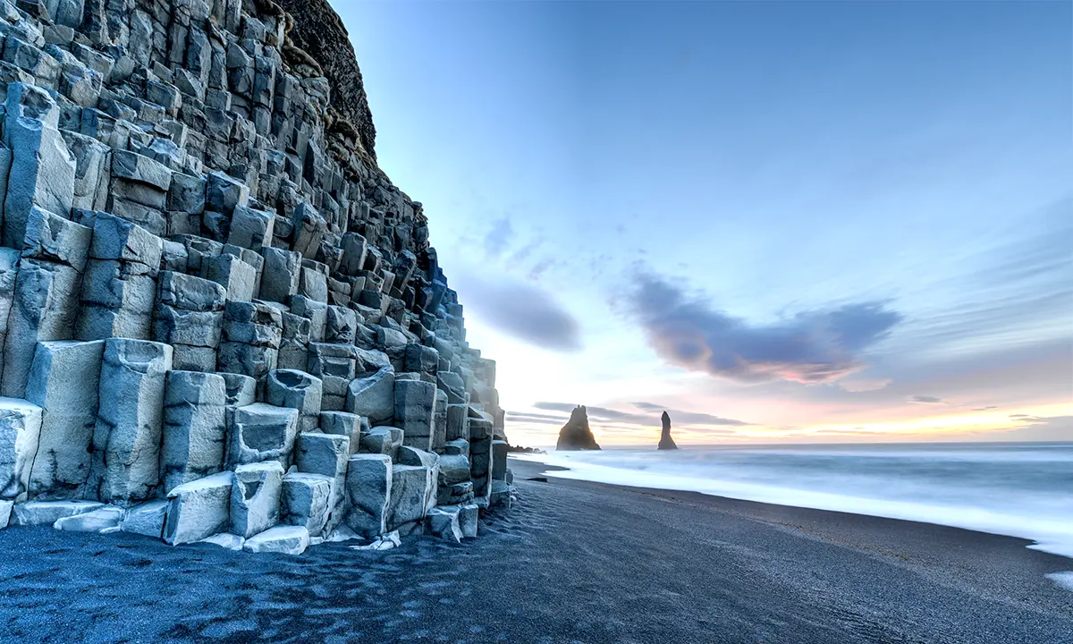 一座火山岩漿冷卻後的岩石經過風化而成的砂礫灘,黑色的玄武岩綿延,映襯著藍的透徹的海水,形成壯麗獨特的自然奇景。
