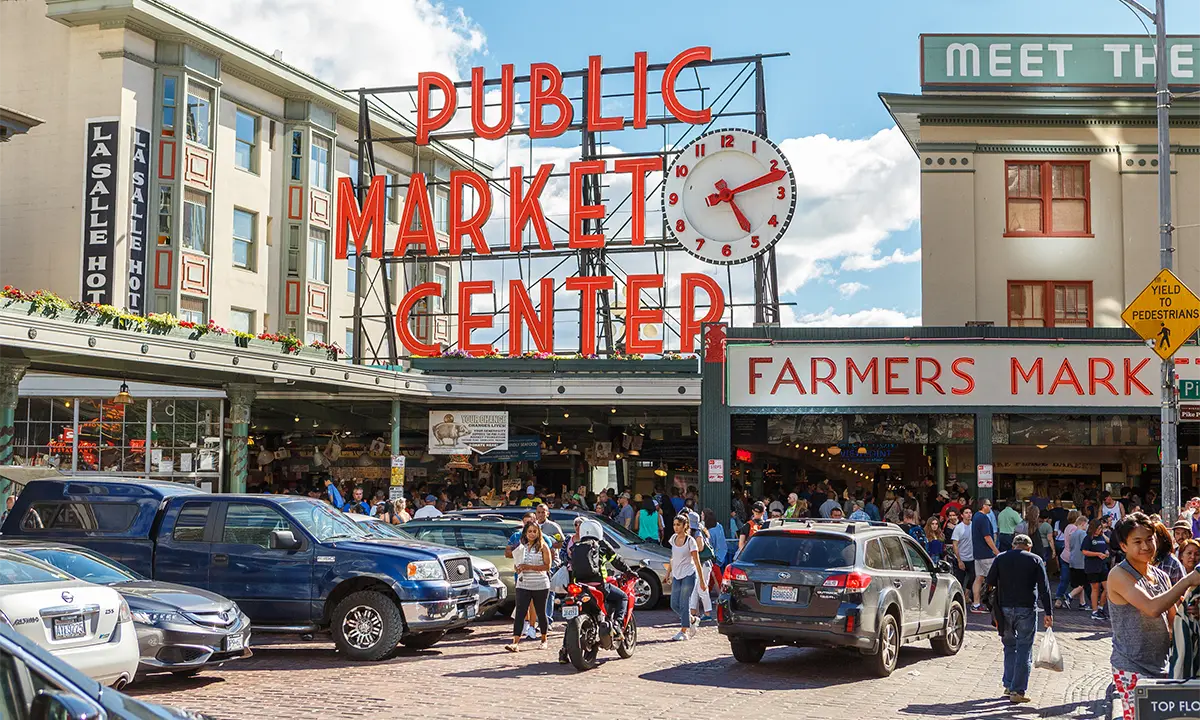 位在入口處的水產攤,店員高超叫賣聲和丟魚技術,吸引無數觀光客駐足欣賞,以及放置於一旁的銅製吉祥豬(瑞秋),在其身上有個投幣孔,自 1986 年來約為市場基金會帶來數十萬美金的收入,在此您還可親臨在 1971 年成立的「星巴克咖啡」創始店。
