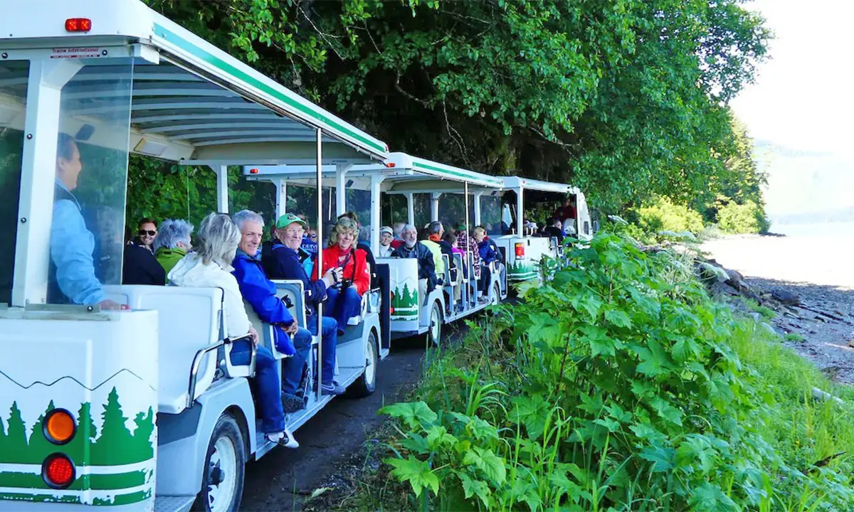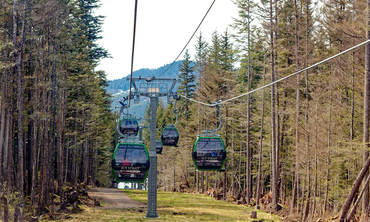 我們將搭乘「高山景觀纜車」,由港口站緩緩攀升至海拔約 381 公尺的 Hoonah Mountain 頂部,纜車提供了 360 度全景視野,整段穿梭在老林與山谷之間,可鳥瞰冰峽點海灣、遊輪和遠方的雪山。當您抵達山頂欣賞美麗的景色之後,我們將轉乘「山林電車」,以開放式的景觀往返約 9 公里的林間旅程,沿途林木包括雲杉與西部鐵杉,花叢與地表苔蘚交織,過程中將有機會看到野生動物。整趟旅程不僅可從空中與地面兩種不同角度,欣賞阿拉斯加密林與冰川海岸,還能深入了解此區的自然與文化背景,是一條極具視野、美感與教育意義的經典體驗。