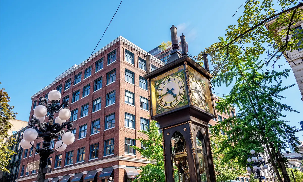是溫哥華的發源地,當時十九世紀末的淘金風潮熱鬧了這裡,直至今天仍保留著百年前維多利亞式的建築,與古色古香的鵝卵石街道景觀,而 1977 年建造的世界第一座「蒸汽鐘」,約隔 15 分鐘就會鳴汽笛與冒出如氣旋般的白煙~