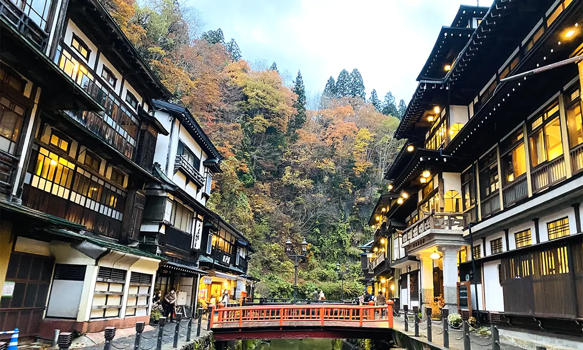 銀山溫泉街位於日本山形縣尾花澤市,是一處充滿懷舊風情的溫泉勝地。溫泉街沿著銀山川而建,兩側林立著大正時代風格的木造旅館,夜晚點起煤氣燈後,彷彿走進百年前的日本街景。這裡以優質溫泉與四季分明的自然景色聞名,秋季造訪時可欣賞周邊山林轉為紅黃相間的楓葉美景,氣氛格外靜謐迷人。