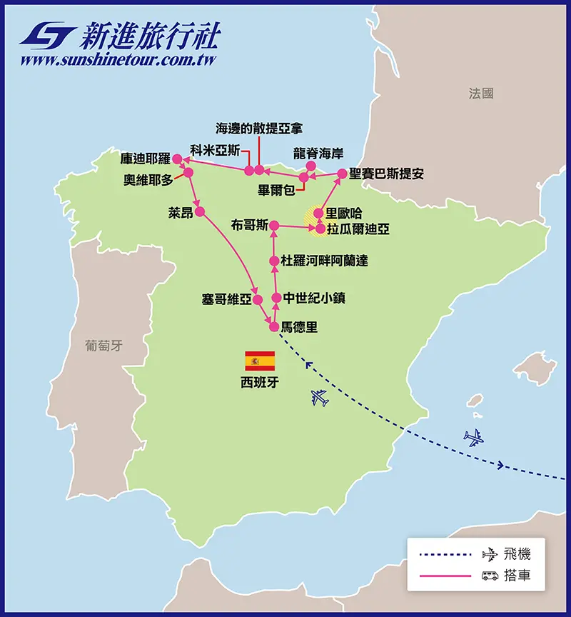 已經去過西班牙了,所以不用再去西班牙?答:西班牙面積非常大,是台灣的 14 倍大, 台灣環島至少要8天7夜 ,玩遍西班牙可是需要至少 100 天以上呢 北部西班牙與大家熟 悉的安達魯西的陽光、熱情 、奔放的風格有所不同。 這裡有西班牙紅酒之鄉里歐哈、 美食之最巴斯克地區、古樸濱海小鎮, 現代藝術解構式建築 ,還有魅力無窮的風土與歷史都足以讓人十分著迷 ~ 不容錯過!