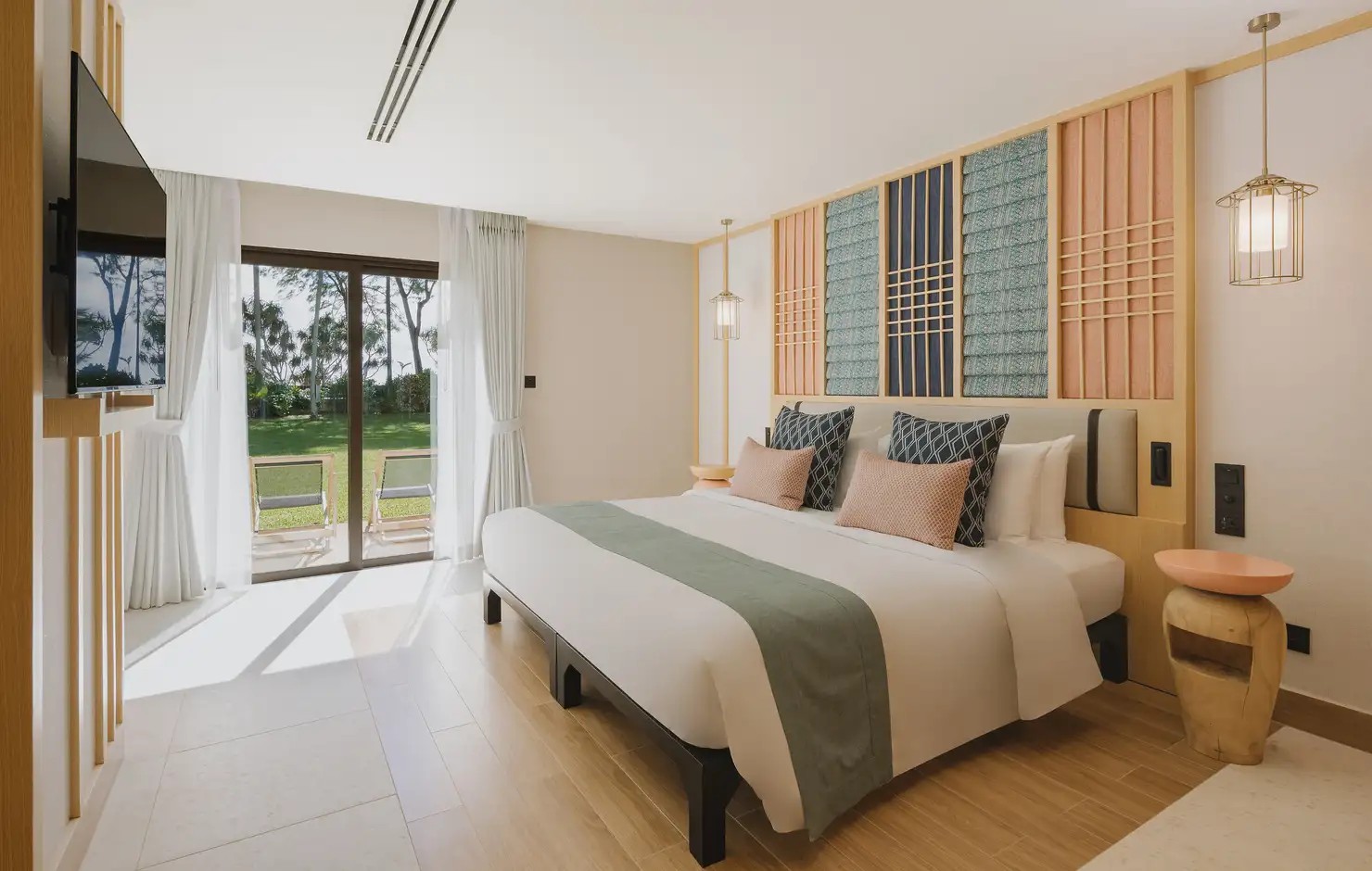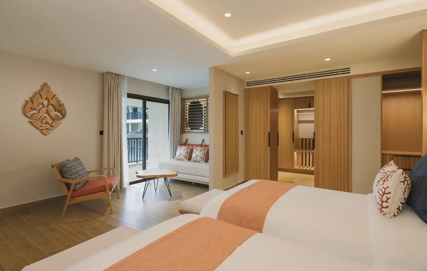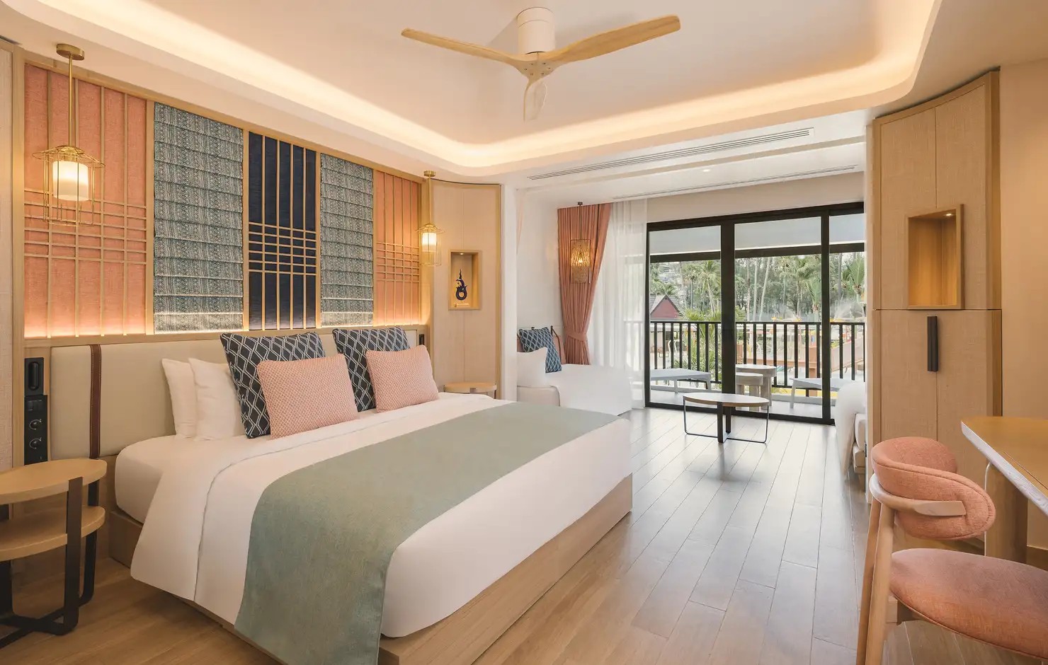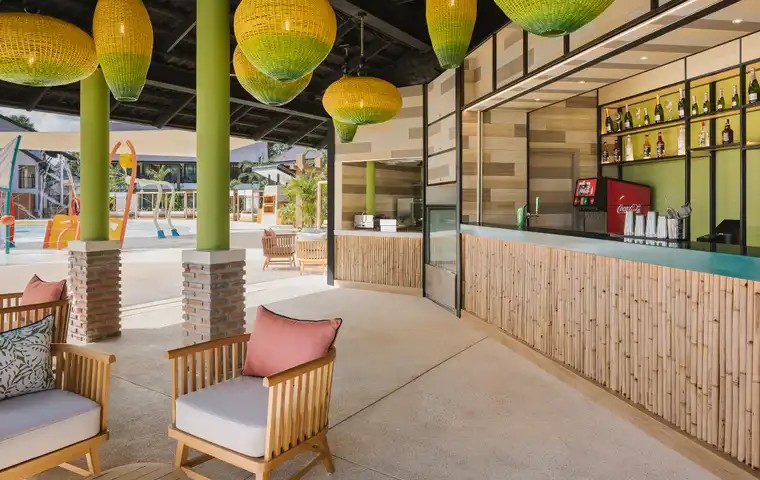 Club Med 普吉島度假村最亮眼的聚會地點「The Sanook 主吧台」,由法國頂尖設計大師 Marc Hertich 設計監督打造,設計靈感來源自泰式傳統燈籠與泰絲上的尊貴紅色與金色等炫麗的色彩元素,打造一個充滿寧靜與放鬆主題的度假風格。