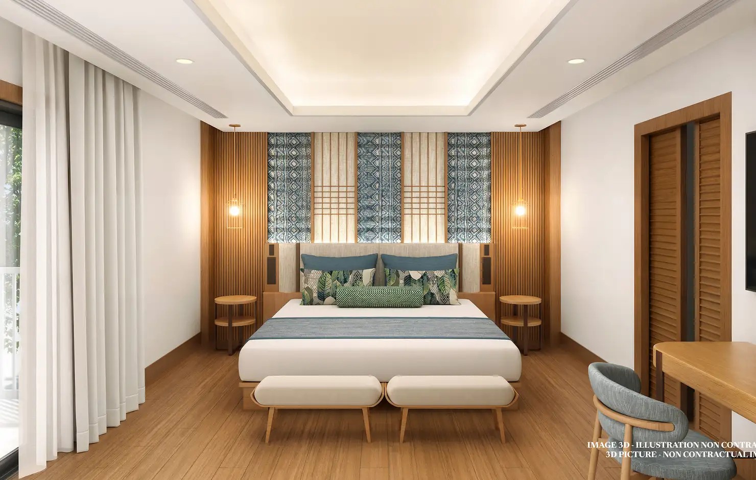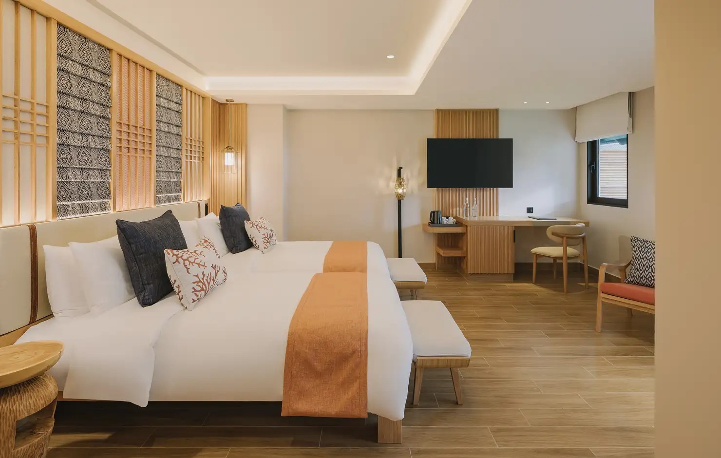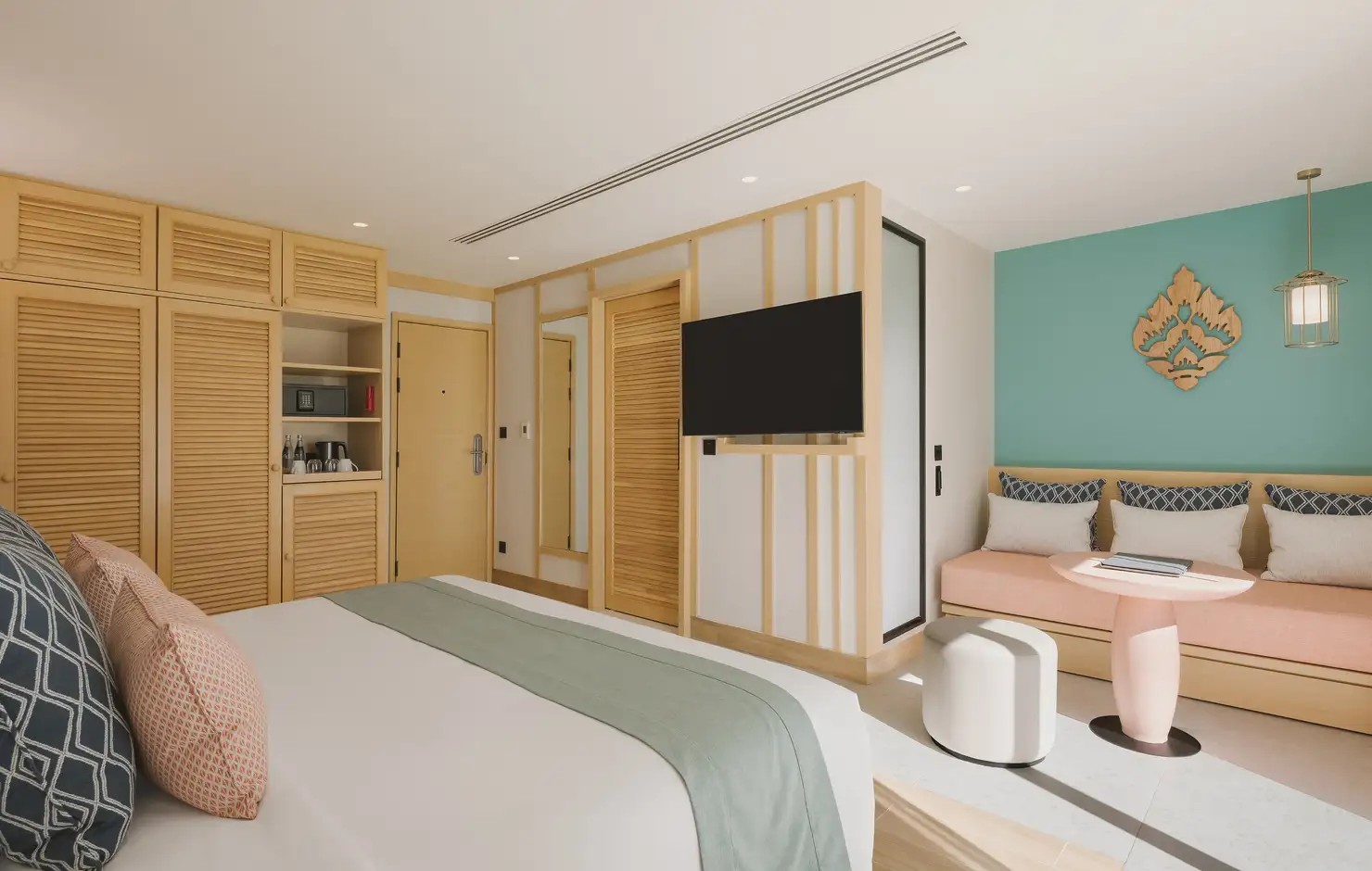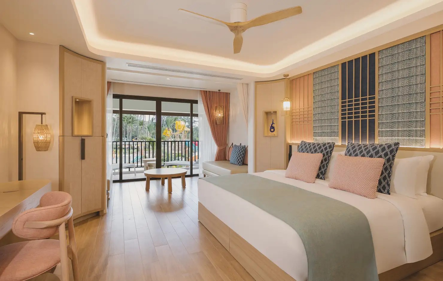 Club Med 普吉島度假村最亮眼的聚會地點「The Sanook 主吧台」,由法國頂尖設計大師 Marc Hertich 設計監督打造,設計靈感來源自泰式傳統燈籠與泰絲上的尊貴紅色與金色等炫麗的色彩元素,打造一個充滿寧靜與放鬆主題的度假風格。